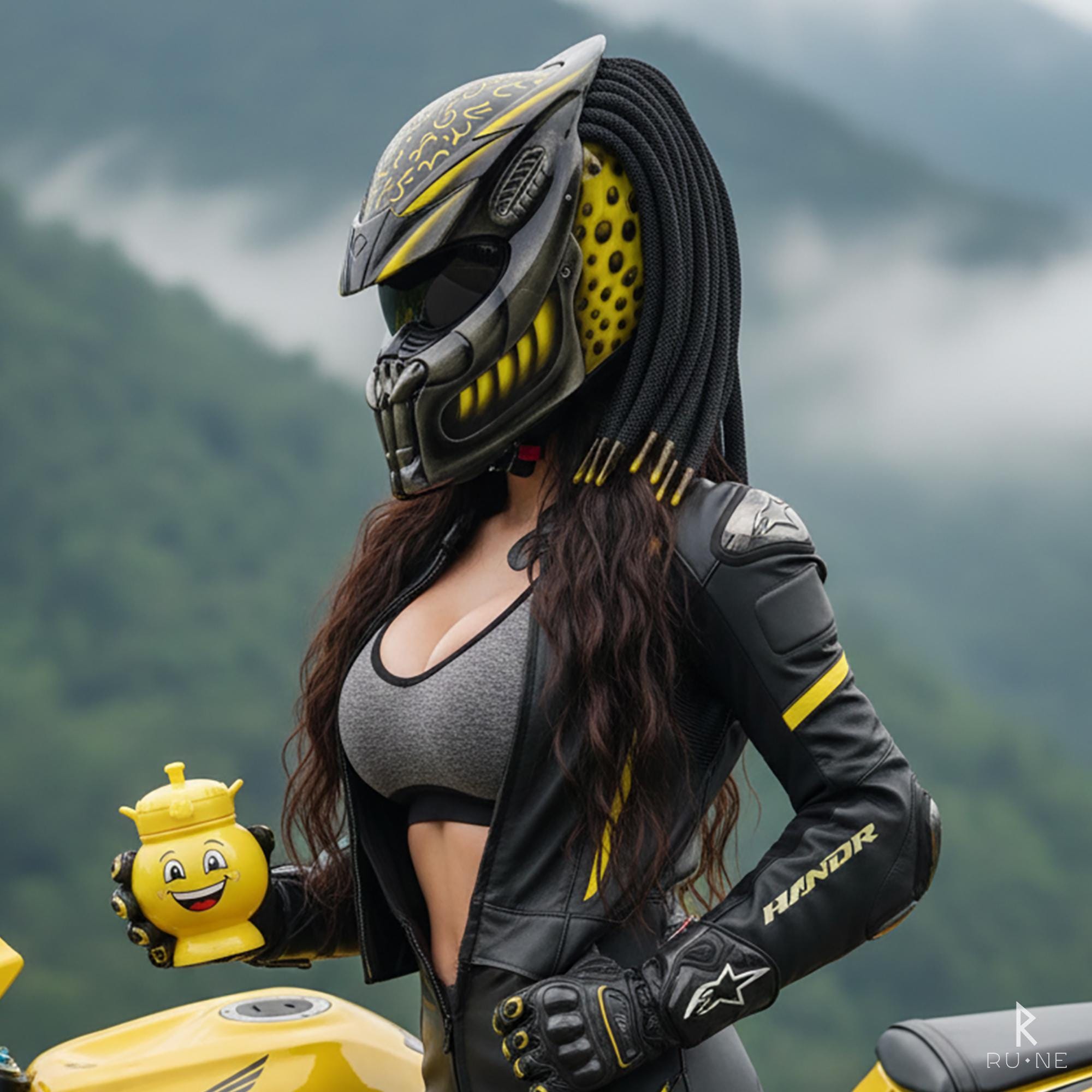 ✅ True predator helmet art in a vibrant yellow gear color palette.