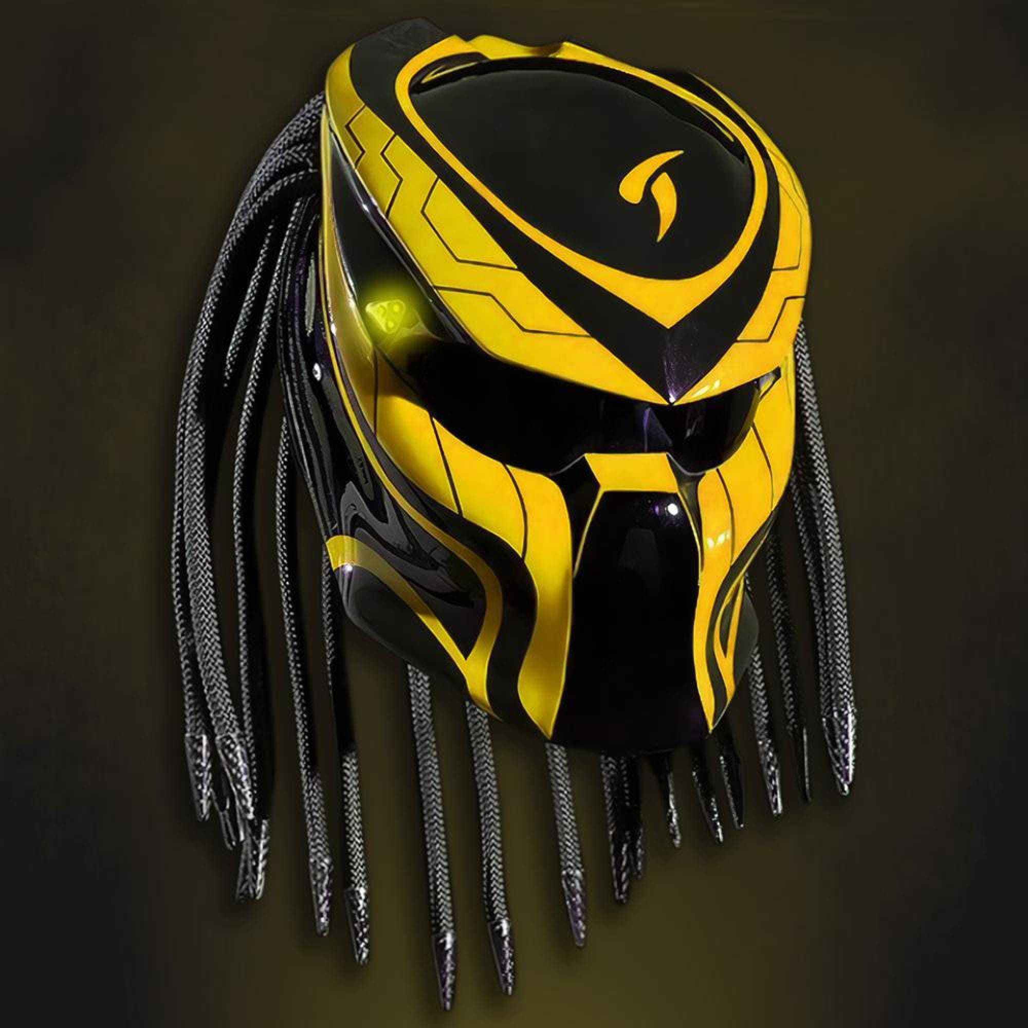 🛡️ Dark Yellow Predator Motorcycle Helmet, Handmade Airbrush Painted Art, DOT & ECE Certified, LED Light