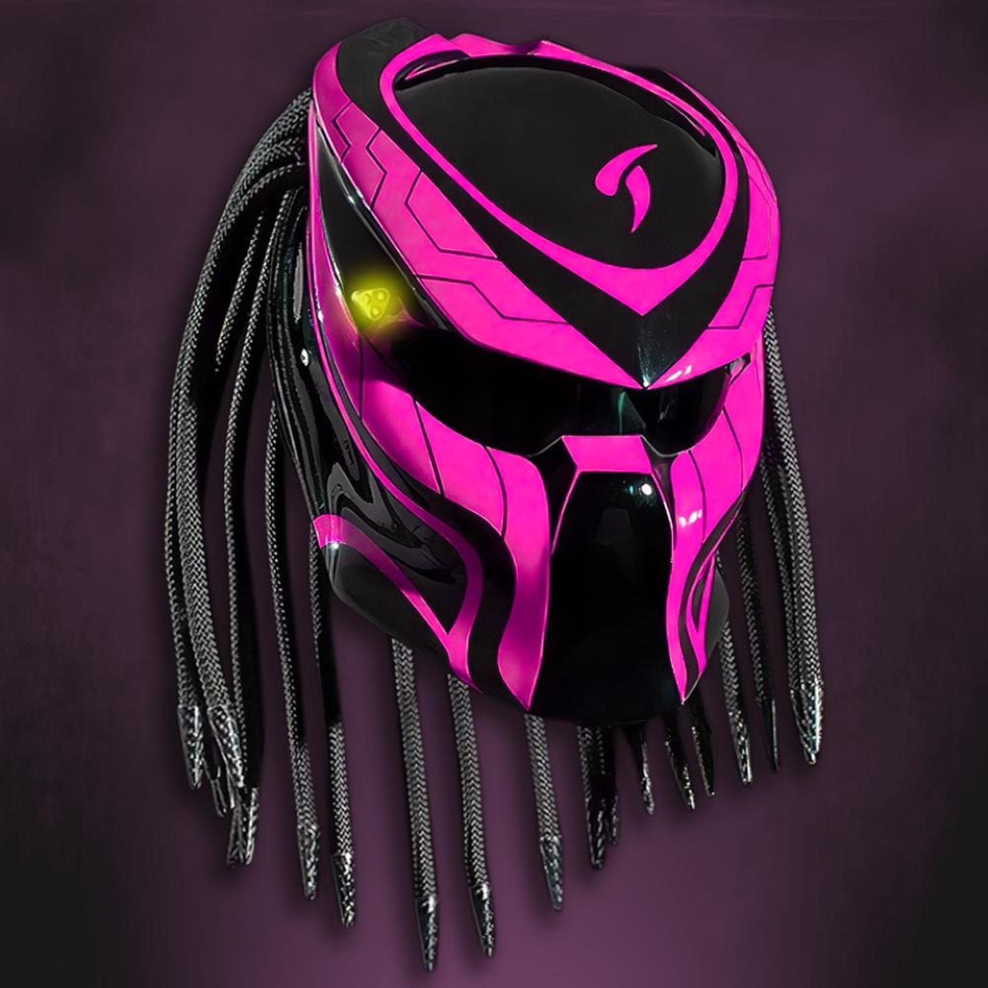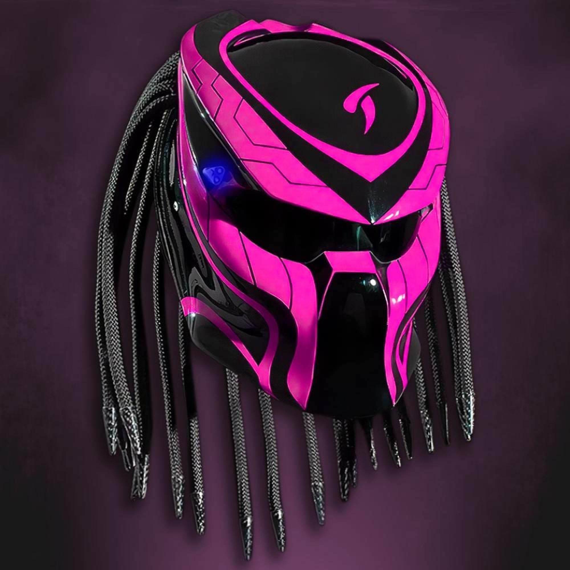 Show off your bold side with our fuscia pink helmet designed for your hot pink motorcycle journeys. This predator helmet isn’t just about color—it captures your uniqueness in every ride. Each runeofficial helmet is individually airbrushed and hand painted for those passionate about magenta biker gear and futuristic biker hat styles. Fully DOT ECE certified for your protection, it also makes a unique biker gift or standout cosplay event gear. Choose from 5 LED colors, explore our range, or contact us to create a custom scheme. With this helmet, your personality isn’t just seen—it’s remembered. Make the most of the cyber monday sale and express your individuality with predator bike gear built just for you.