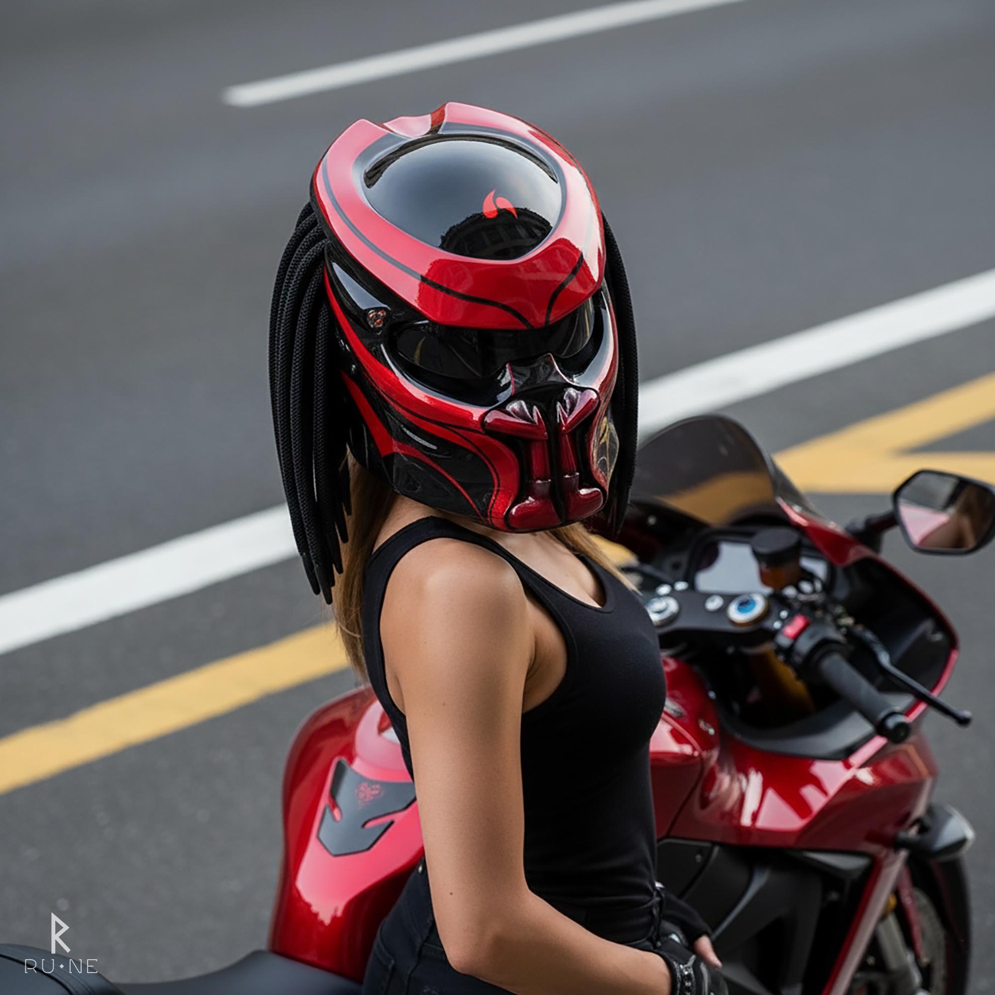 Predator Helmet Glossy Red: Hand-Painted Custom Detail, Anti-Fog Visor, LED Light, DOT ECE Certified