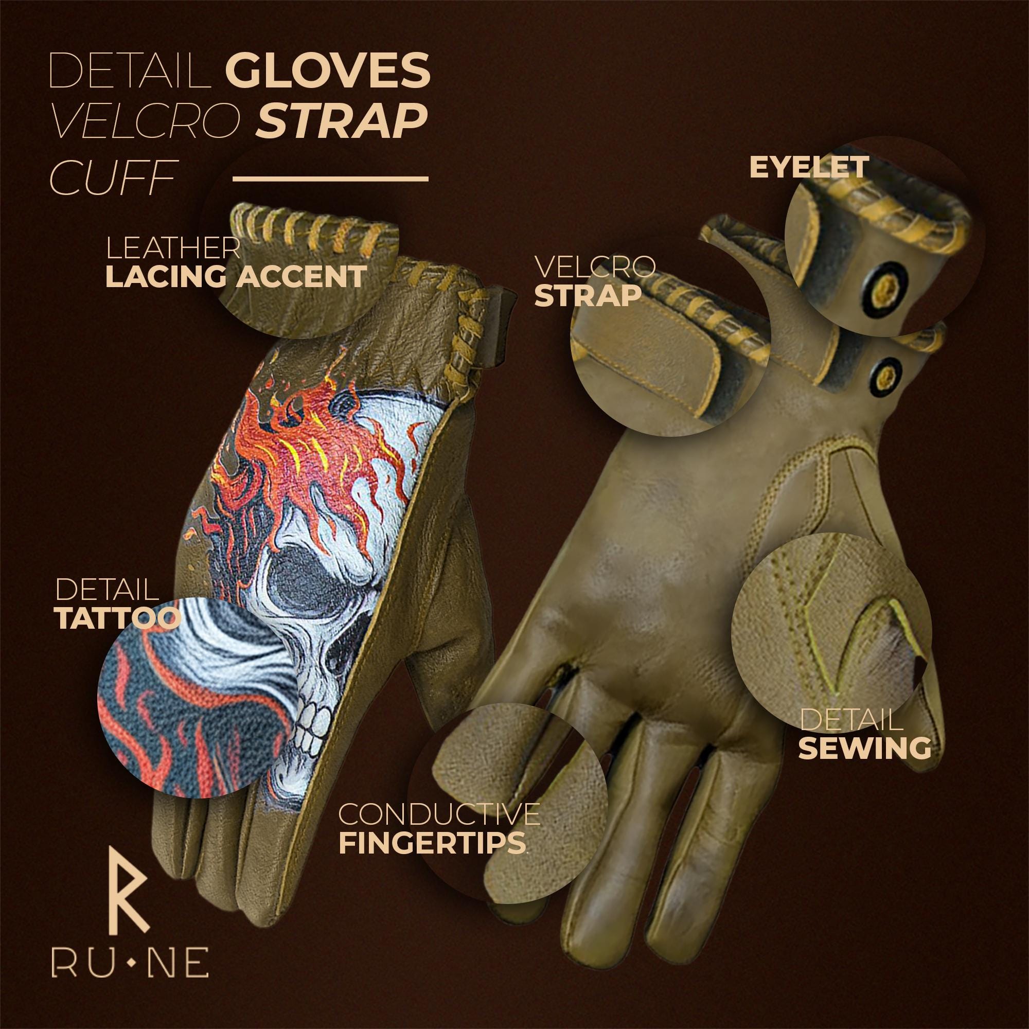 Unleash a fiery nightmare on the asphalt with these Skull Fire Tattoo Gloves. Handcrafted from supple lambskin, this design is forged in flames and rebellion, making it a piece of wearable art for the rider who commands the road.