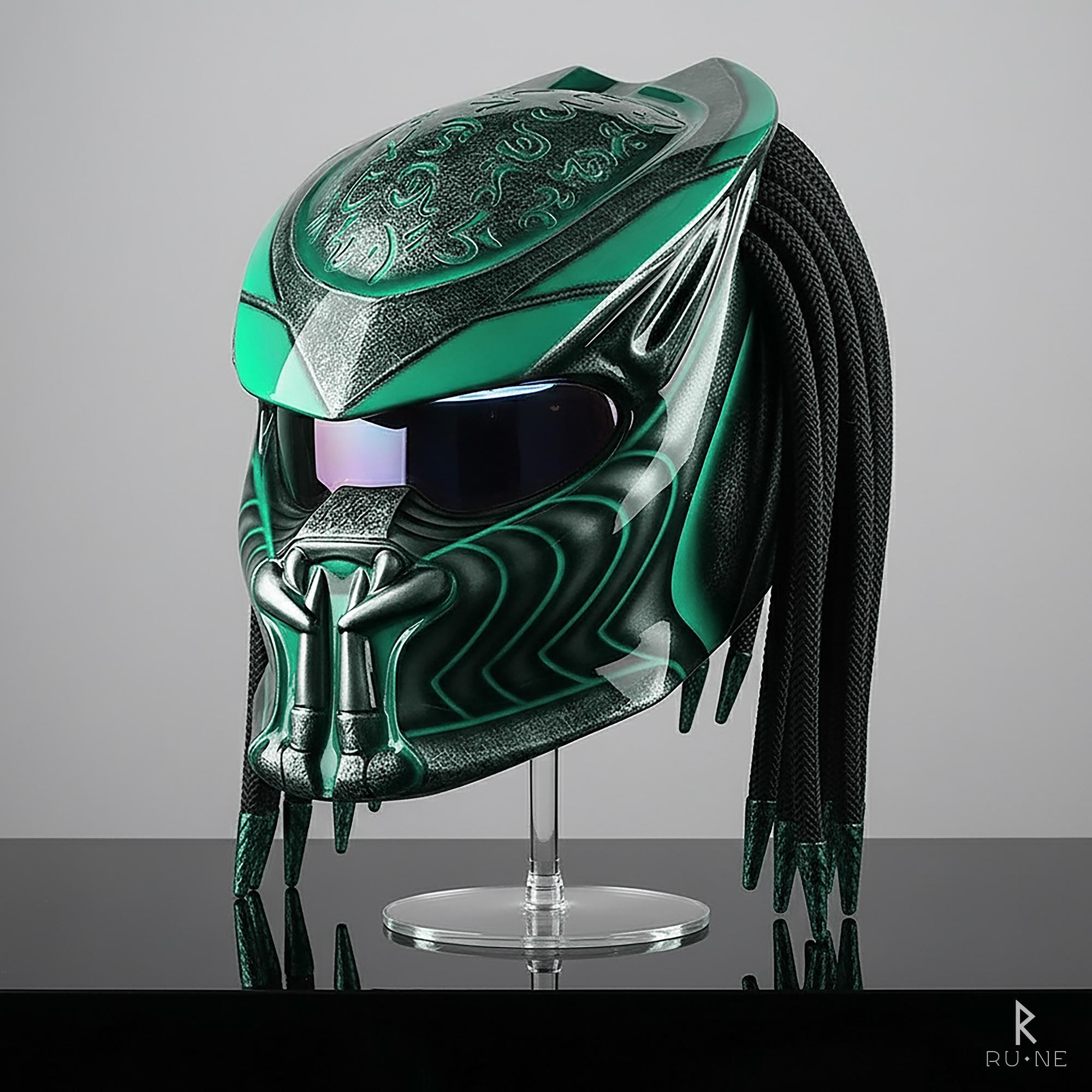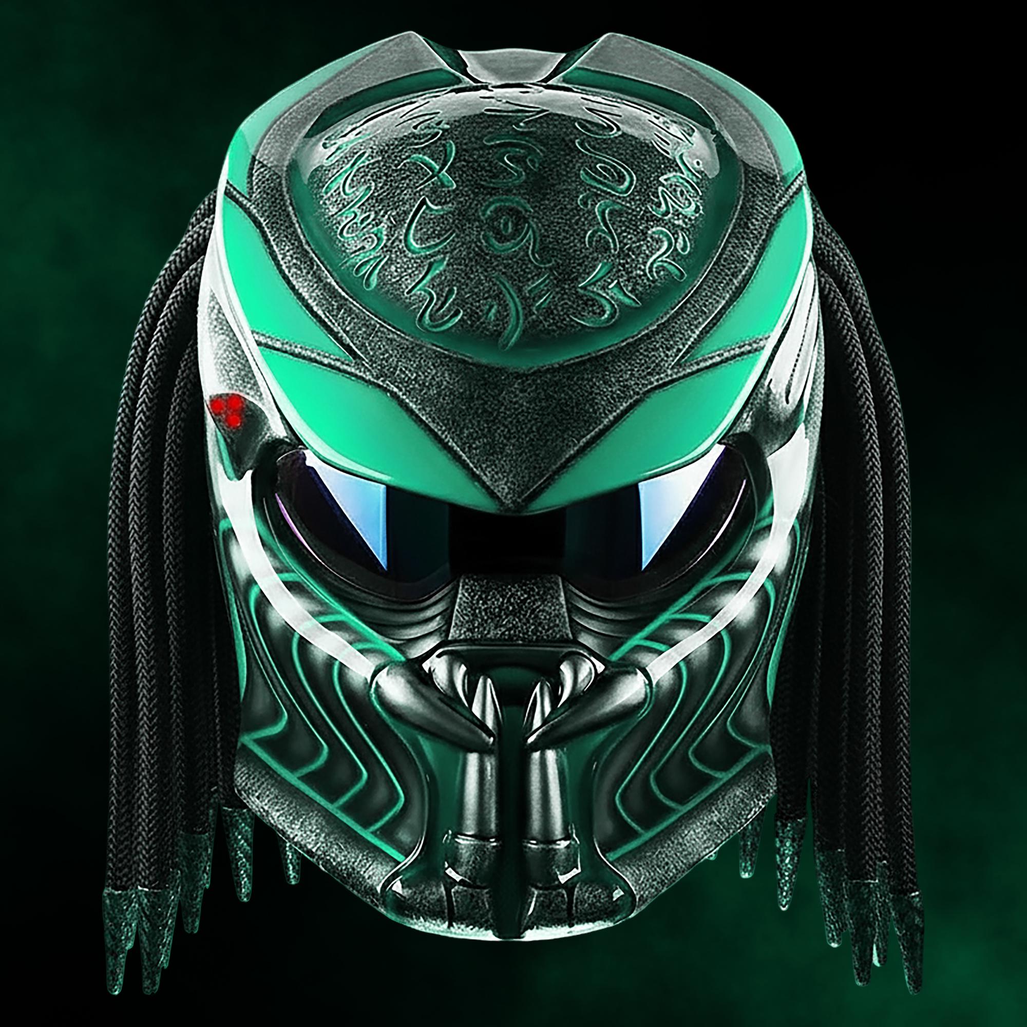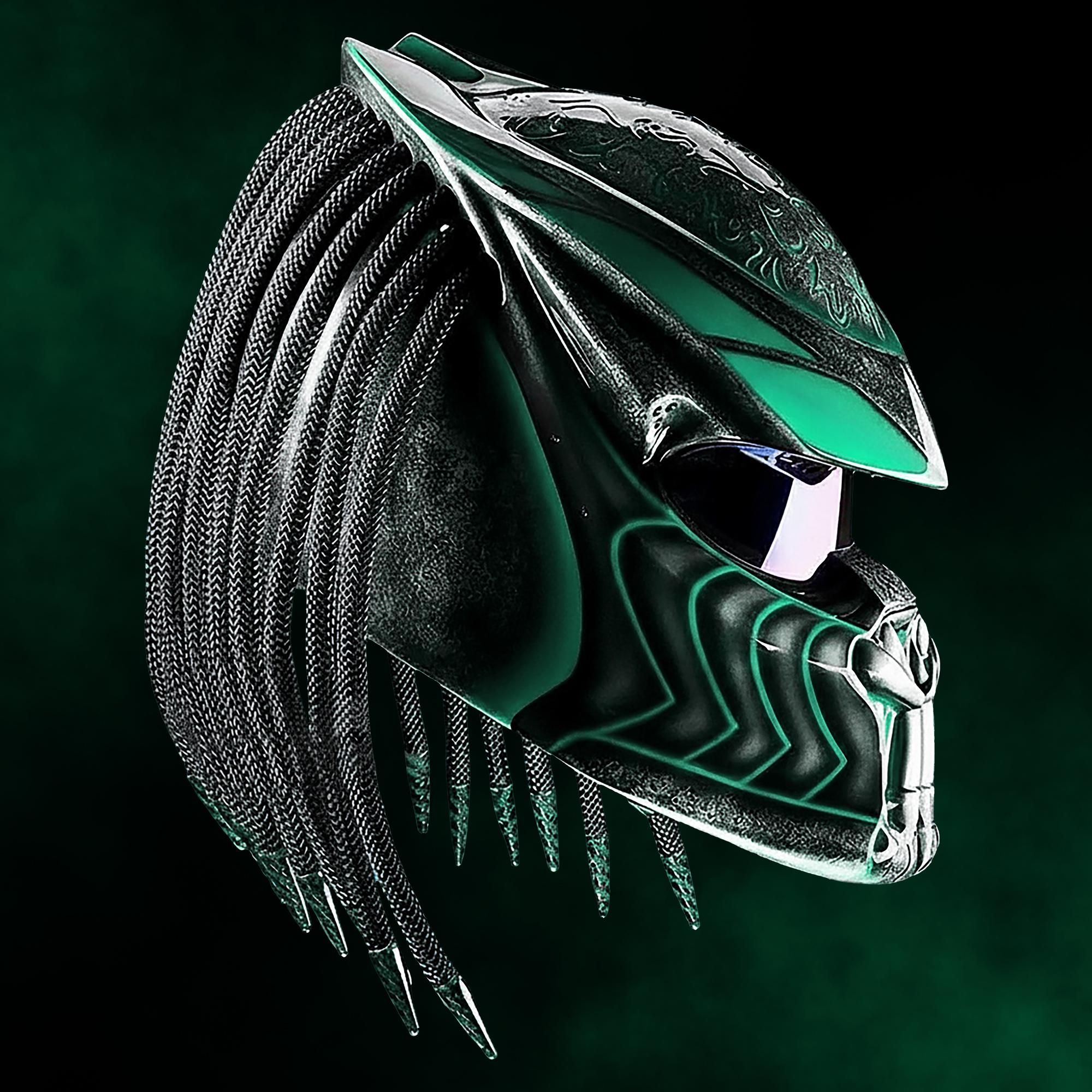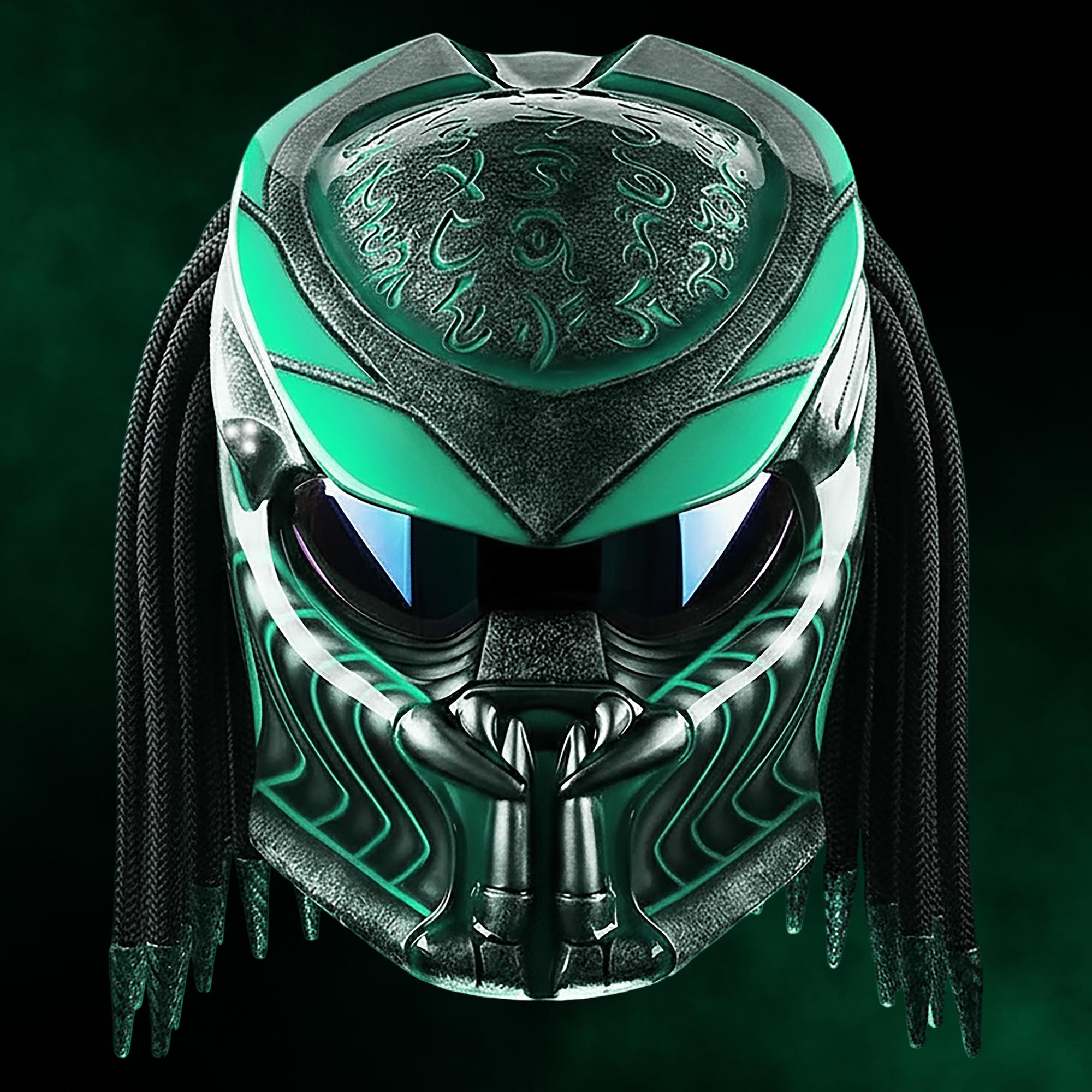 Melt into the shadows with the Green Relax Badlands Predator Motorcycle Helmet, a stealthy yet striking masterpiece of Handmade Airbrush art. The intricate Fang texture helmet combines deep greens with subtle accents, embodying the quiet menace of an Apex Hunter lurking in uncharted territories. More than just a Predator Mask Custom, this helm brings the mystique of the Predator Badlands to life, perfect for riders who command respect with understated power and unique style.