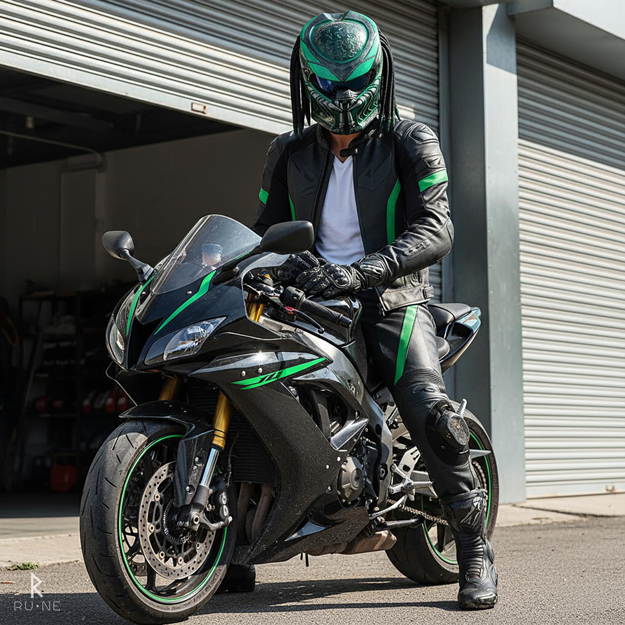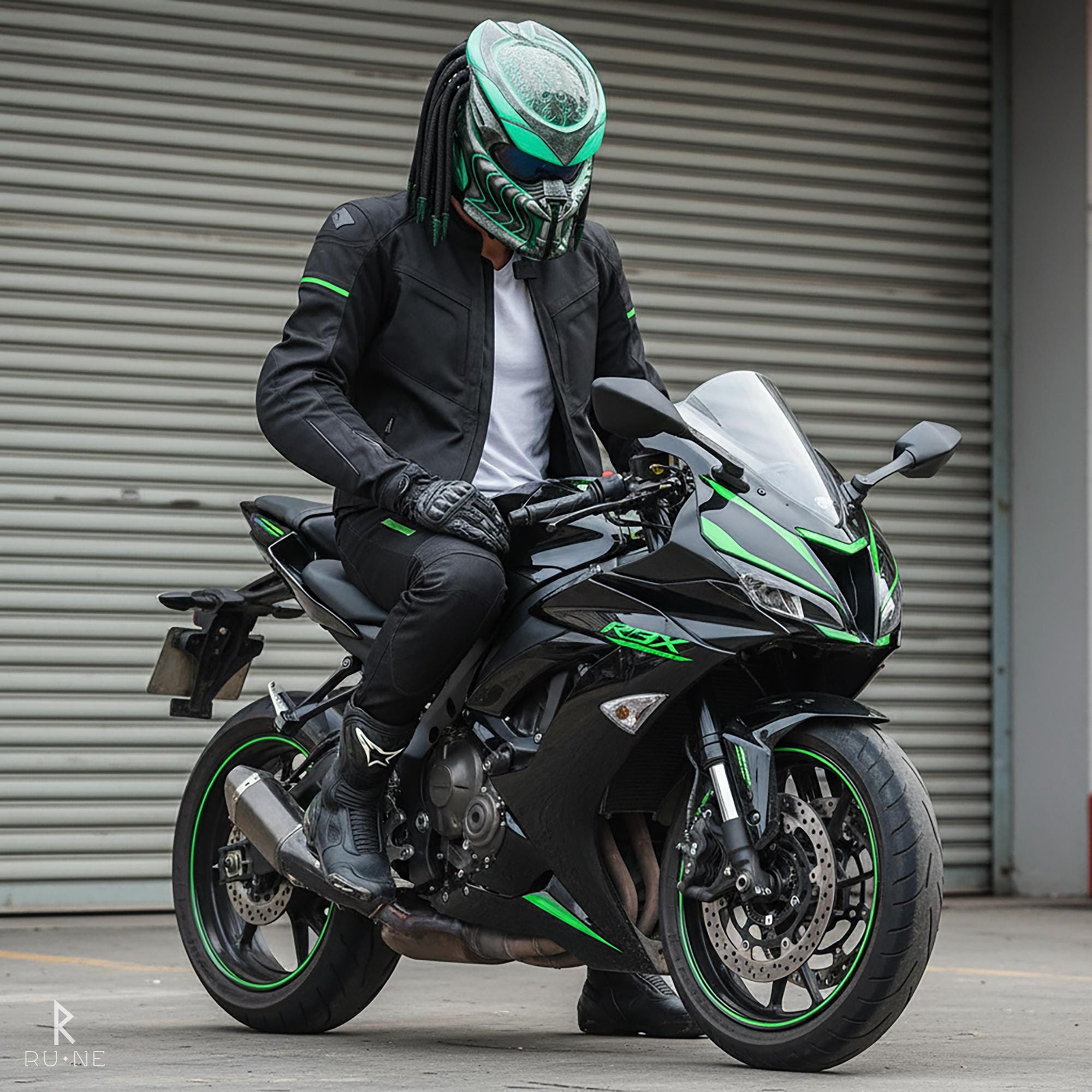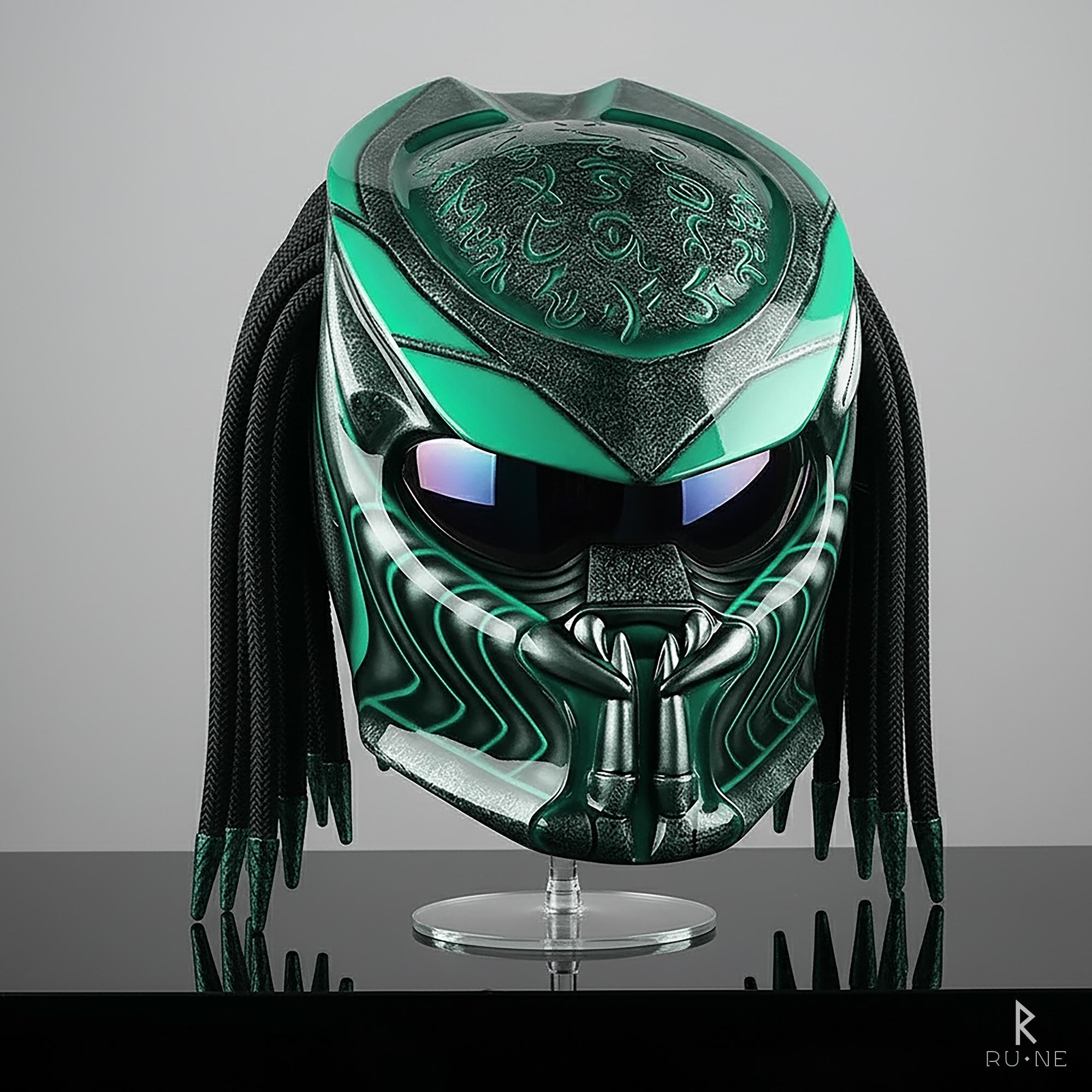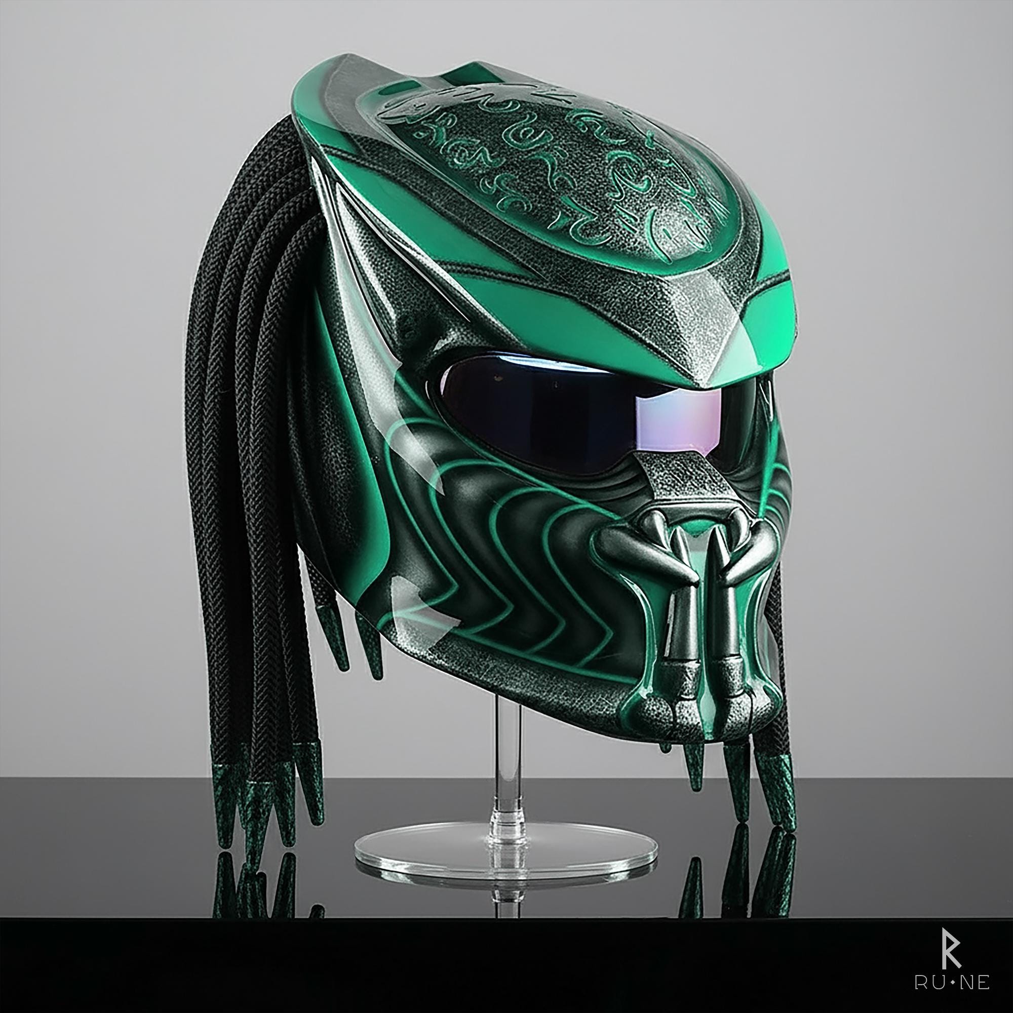 Melt into the shadows with the Green Relax Badlands Predator Motorcycle Helmet, a stealthy yet striking masterpiece of Handmade Airbrush art. The intricate Fang texture helmet combines deep greens with subtle accents, embodying the quiet menace of an Apex Hunter lurking in uncharted territories. More than just a Predator Mask Custom, this helm brings the mystique of the Predator Badlands to life, perfect for riders who command respect with understated power and unique style.